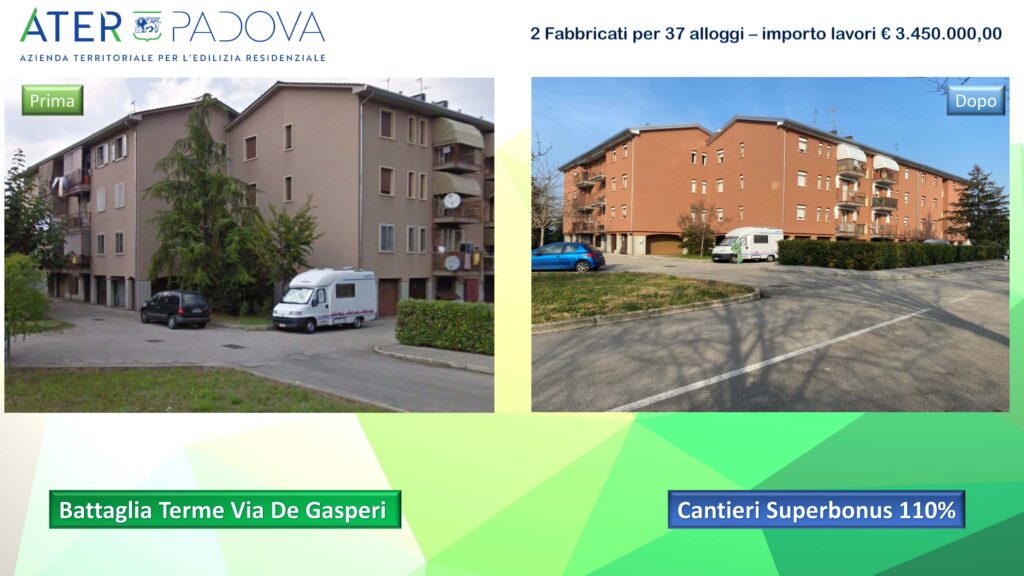 Completati con successo i lavori del Superbonus 110 via Pistore a Battaglia Terme. La ristrutturazione ha coinvolto 37 alloggi ubicati su 2 fabbricati per un importo dei lavori di 3.450.000 euro. Gli interventi si sono concentrati sulla ristrutturazione energetica, includendo l’isolamento termico a cappotto dell’edificio, o, la sostituzione degli infissi, della caldaia, la sistemazione dei poggioli, l’installazione di elementi parasole e un impianto fotovoltaico condominiale. Questi interventi garantiranno una maggiore efficienza energetica, riducendo i consumi e contribuendo ad un positivo impatto sull’ambiente.