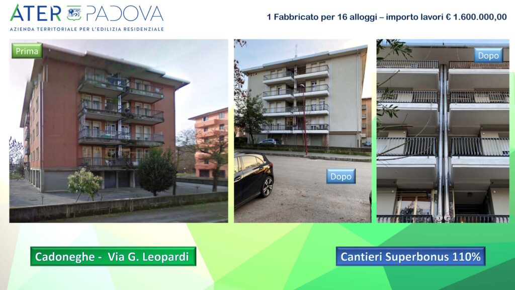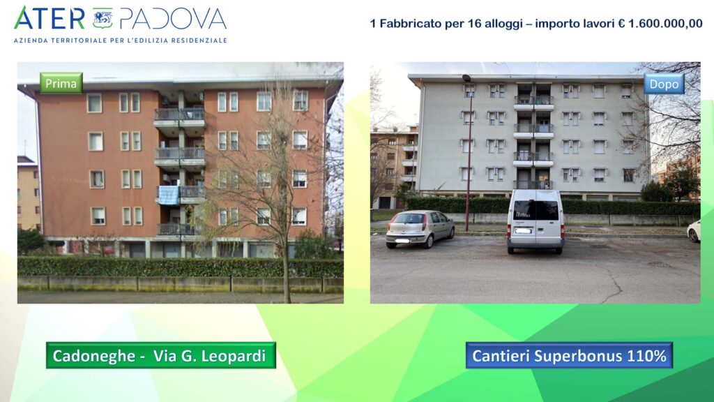 La ristrutturazione ha coinvolto 16 alloggi ubicati su 1 fabbricato per un importo dei lavori di 1.600.000 euro. Gli interventi si sono concentrati sulla ristrutturazione energetica, includendo l’isolamento termico a cappotto dell’edificio, la sostituzione degli infissi, della caldaia, la sistemazione dei poggioli, l’installazione di elementi parasole e un impianto fotovoltaico condominiale. Questi interventi garantiranno una maggiore efficienza energetica, riducendo i consumi e contribuendo ad un positivo impatto sull’ambiente.