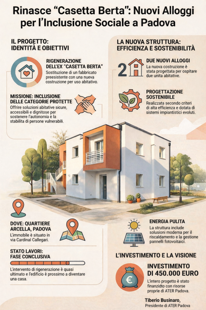 I lavori di rigenerazione dell’immobile noto come “Casetta Berta”, in via Cardinal Callegari (quartiere Arcella), sono entrati nella fase conclusiva. L’edificio è ormai prossimo alla piena disponibilità e potrà essere destinato a uso abitativo.